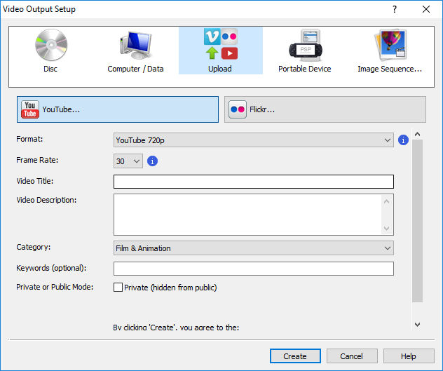 Use the Upload output option to upload your movie to YouTube or Flickr. YouTubeYou must create a YouTube "channel" for your Google account before you can upload any videos. See Create a channel for more information. Once this is done, click the YouTube button on the Upload page for YouTube upload setup. Your video file will be stored in a temporary location in FLV format (flash video). You can choose to have your temporary file deleted after successful upload. |
