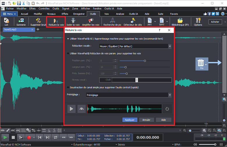 Transformez la musique live en séance de karaoké!Utilisez n'importe quelle musique en streaming de Spotify, YouTube, Pandora, Apple Music, etc. et la fonction Live Karaoke de DeskFX pour démarrer votre jam karaoké. Jouez votre chanson préférée et chantez de tout votre cœur ! Télécharger DeskFXSupprimez les voix sur votre musique pré-enregistrée!Supprimez facilement les voix de vos fichiers musicaux. Utilisez différentes options telles que la réduction vocale paramétrique, la simple soustraction de canal ou laissez l'IA faire la magie ! Créer des chansons de karaoké n'a jamais été aussi simple. Télécharger WavePad |